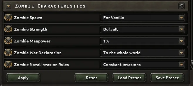 - choose the rules for declaring war on zombies (either they declare war only on neighbors, or on the whole world).