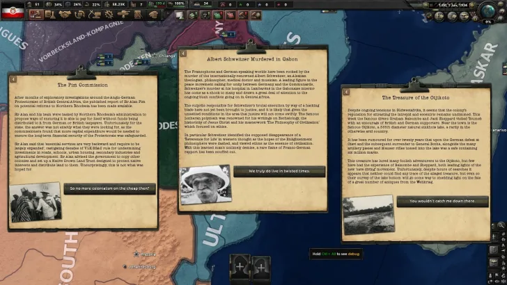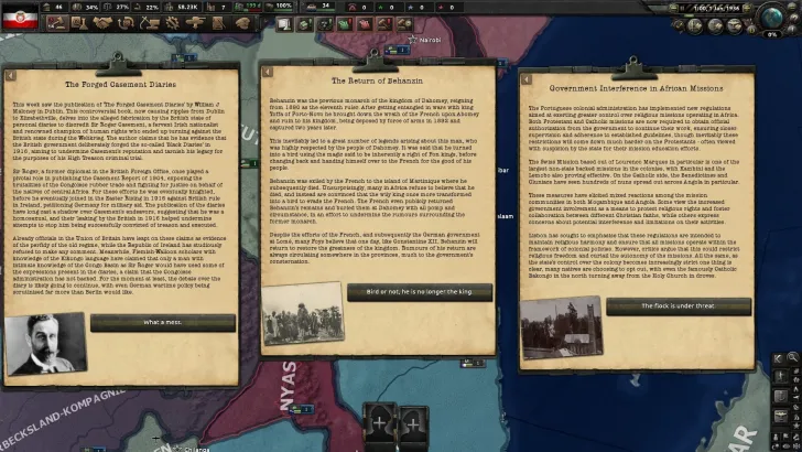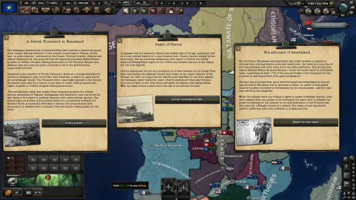 This mod adds over a thousand events to nations old and new, and brings around twenty new focus trees into the game. It is designed to turn Mittelafrika and other overseas colonies from absurdly stable ahistorical monoliths into a collection of fractious nations-in-waiting, seething with nationalist fervour and poised to overthrow their rulers. A number of new tags have been added, not to mention new focus trees, icons, and events.