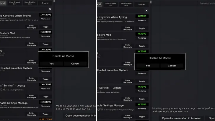 This mod adds confirmation dialog boxes to the "Enable All" and "Disable All" buttons in the mod menu. This prevents you from accidentally enabling or disabling all your mods at once.