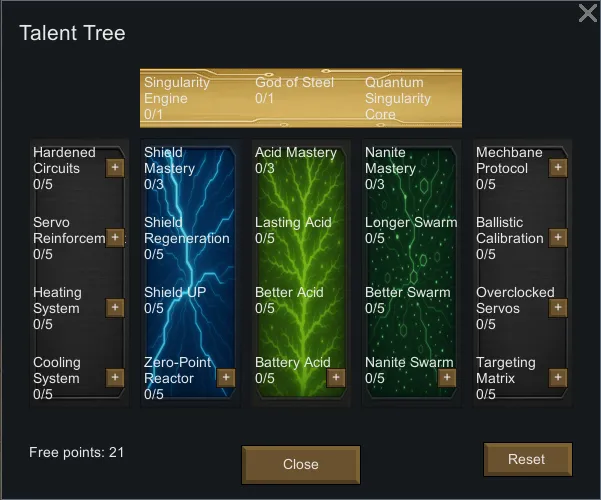 Specialize on Energy/Acid/Nanites with unique bonuses. you get one Talentpoint every 50 LVL.