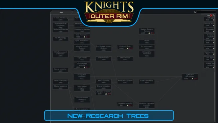 - Some users may be unable to scroll down in the vanilla research UI when on the SWKotOR tab, cutting off some of the research projects from view. I have zero clue what to do about this other than recommending a research UI overhaul mod since I think this is a base game issue, and my research projects & tab seem to be set up correctly in xml. TO FIX THIS I strongly recommend using this mod or another research screen overhaul mod: https://steamcommunity.com/sharedfiles/filedetails/?id=3263594757