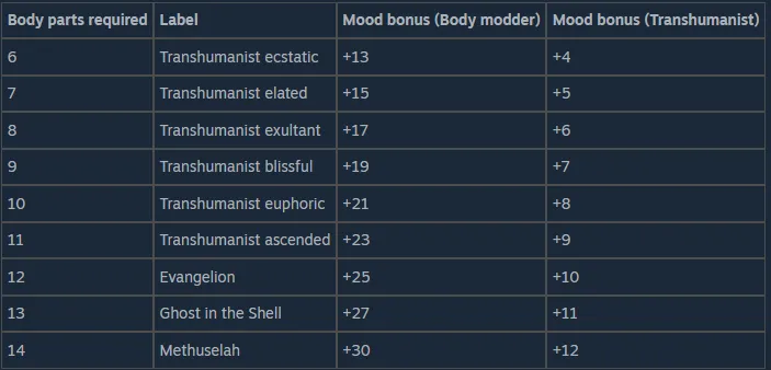 Adds 8 new levels to the body modder trait & transhumanist precept, each with unique descriptions and an ever-increasing mood bonus: