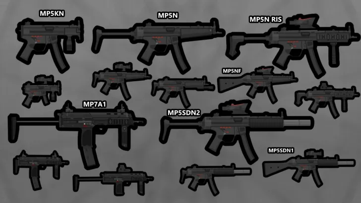 Many weapons feature attachable bayonets, suppressors, and folding stocks.
