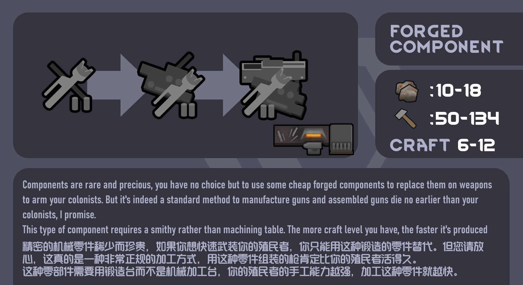 For most low tech factions, components are rare and expensive. If you urge to gather an army, you shall get something to replace it. Forged Weapon Component is the replace. For common case, these forged components require a stamp machine to manufacture. However in rimworld, you have only manual method unless you find some machine to do your job.
