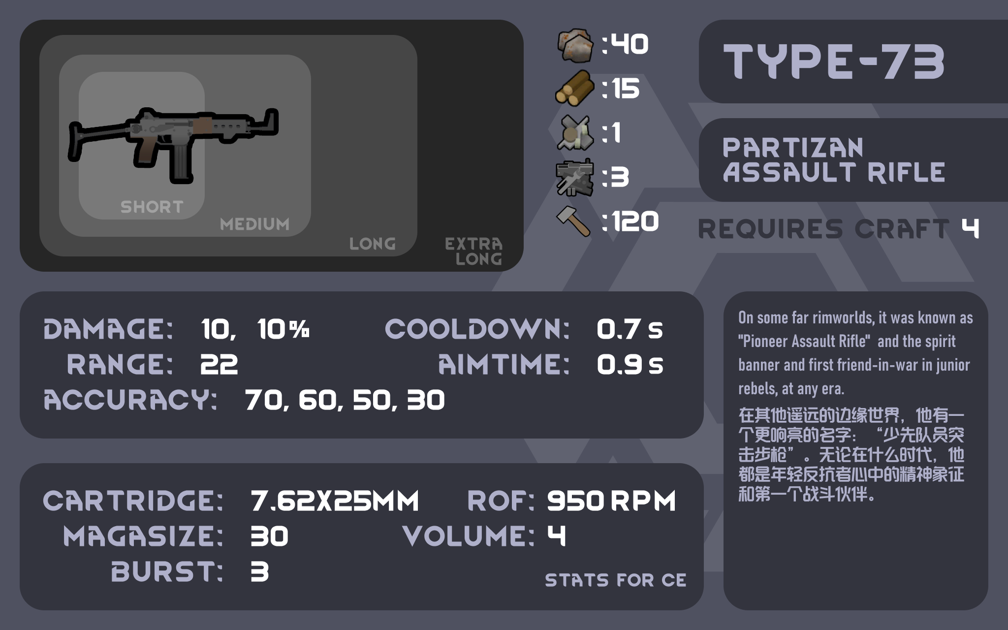 They are mostly 1980s formal weapons and participated many counter-invasion wars. When the "Last War" was triggered, their blueprints are sealed to prepare after-war production. In early space era, these weapons are also used to equip early space colony because they are easy to manufacture. They were ultimately replaced by Harbinger Rifles, but their blueprints spread, and that's why you can see them in rimworld.